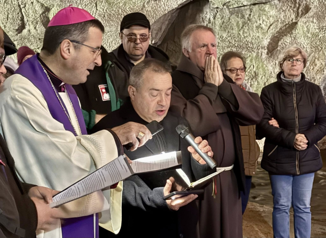 Kép: A Bóli barlangban, nagyszerdán, Kerekes László segédpüspök úrral és a gyermekeinkkel, együtt imádkozunk, az áldott békéért.