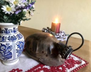 Kép: Hajdani bányász sisakom mellett meggyújtottam egy gyertyát és elmondtam egy imát a bányász tárasimért.