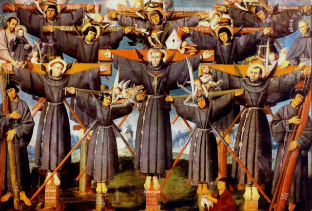 Japánban Xavéri Szent Ferenc kezdte meg a hittérítést. Ő maga nem sok eredményt láthatott, de a következő évtizedekben seregestől tértek meg az emberek, és 1587-ben már mintegy 250.000 lelket számláló katolikus közösség élt Japánban Nagasaki központtal. De éppen ebben az esztendőben az ország ura, Toyotomi Hideyosi (1582--1598), aki korábban elnéző volt a keresztényekkel szemben, a kudarcba fulladt koreai háború miatt ellenük fordult: a jezsuitákat kiutasította az országból. Rendelkezését azonban nem vették szigorúan, így néhány jezsuita eltávozott, a többség viszont helyben maradt és titokban tovább folytatta a térítést.