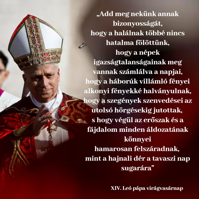 „Szűz Mária, a harmadik nap Asszonya, adj nekünk bizonyosságot arról, hogy mindennek ellenére a halál többé nem fog hatalmat gyakorolni felettünk. Hogy a népek igazságtalanságainak napjai meg vannak számlálva. Hogy a háborúk vakító villanásai alkonyati fényekké halványulnak. Hogy a szegények szenvedései utolsó leheletüket veszik. […] És hogy végre az erőszak és a fájdalom minden áldozatának könnyei hamarosan elapadnak, mint a dér a tavaszi napon” – zárta virágvasárnapi homíliáját XIV. Leó pápa.