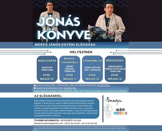 Aggódom a gyermekeinkért, és ezért meghívtam Merc János debreceni színház kiváló művészét, hogy adja elő Erdélyben is Babits Mihály által a második világháború előestéjén írt gyönyörű költeményt, a Jónás Könyvét. Én láttam ezt a megrendítő 40 perces előadást, ezért is hívlak szeretettel, hogy nézzük meg együtt, és utána vegyünk részt egy bűnbánati szentmisén. A templom, tudjátok „menedékhely”, ahová Jézus szeretne összegyűjteni, az oltár körül, mint kotló a csibéit!