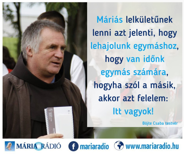b_300_300_16777215_00_images_stories_Jo_Rendezvenyek_550876396_1235954348573065_1499103786979060743_n.jpgMáriás lelkületűnek lenni azt jelenti, hogy lehajolunk egymáshoz, hogy van időnk egymás számára, hogyha szól a másik, akkor azt felelem: Itt vagyok!