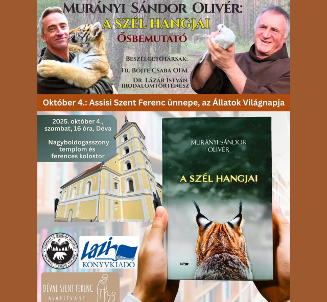 b_300_300_16777215_00_images_stories_Jo_Rendezvenyek_A_szl_hangjai_pakt_Dva.jpgMurányi Sándor Olivér író fenti címmel megjelent kötetének ősbemutatójára kerül sor október 4-én, Assisi Szent Ferenc ünnepén, az Állatok Vilgnapán, szombaton 16 órától a dévai ferences kolostorban.