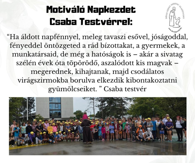 b_300_300_16777215_00_images_stories_Csaba_levelek_Resized_546884721_122208871586265175_309803862504110609_n.jpgHa áldott napfénnyel, meleg tavaszi esővel, jóságoddal, fényeddel öntözgeted a rád bízottakat, a gyermekek, a munkatársaid, és még a hatóságok is- akár a sivatag szélén évek óta töpörödő, aszalódott kis magvak- megerednek, kihajtanak, majd csodálatos virágszirmokba borulva elkezdik kibontakoztatni gyümölcseiket.