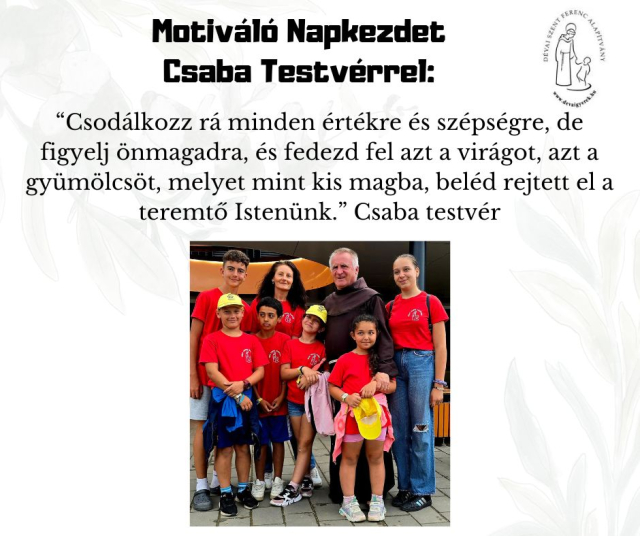 Fedezd fel a világot Nyomtatás Csodálkozz rá minden értékre és szépségre, de figyelj önmagadra, és fedezd fel azt a világot, azt a gyümölcsöt, melyet mint kis magba, beléd rejtett el a teremtő Istenünk. Csaba testvér