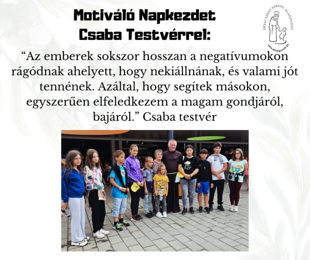 b_300_300_16777215_00_images_stories_Csaba_levelek_Resized_557419406_122212018364265175_3090507460941228406_n.jpgAz emberek sokszor hosszan a negatívumokon rágódnak ahelyett, hogy nekiállnának, és valami jót tennének. Azáltal, hogy segítek másokon, egyszerűen elfeledkezem a magam gondjáról, bajáról.