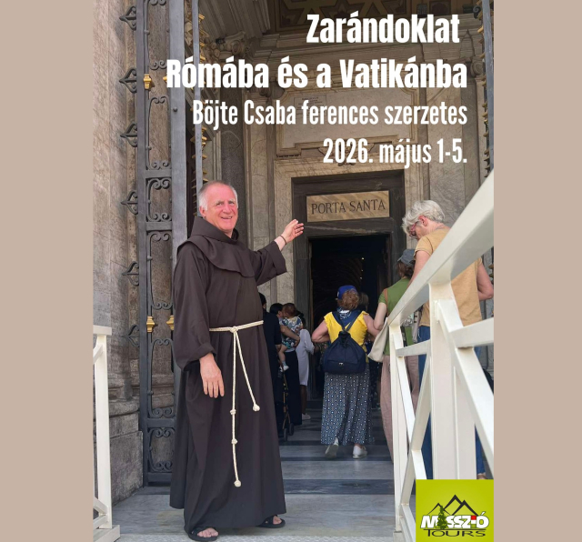 Rőviden 2026. április 02. Találatok: 181 Zarándoklat Rómába és a Vatikánba Nyomtatás E-mail Jelentkezzen ma és fedezze fel Rómát Böjte Csaba ferences testvérrel! 2026. május 1-5. - 5 nap/4 éj - Szentmise a Szent Péter bazilika magyar kápolnájában - UNESCO világörökségi helyszín: Róma történelmi központja - Vatikán, a keresztény világ központja Bővebb információért keressen bízalommal Tovább tweet