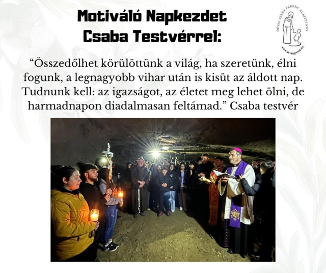 b_300_300_16777215_00_images_stories_Csaba_levelek_Resized_658693168_122240100848265175_8905822440242837114_n.jpgÖsszedőlhet körülöttünk a világ, ha szeretünk, élni fogunk, a legnagytobb vihar után is kisüt az áldott nap. Tudnunk kell: az igazságot, az életet meg lehet ölni, de harmadnapon diadalmasan feltámad.