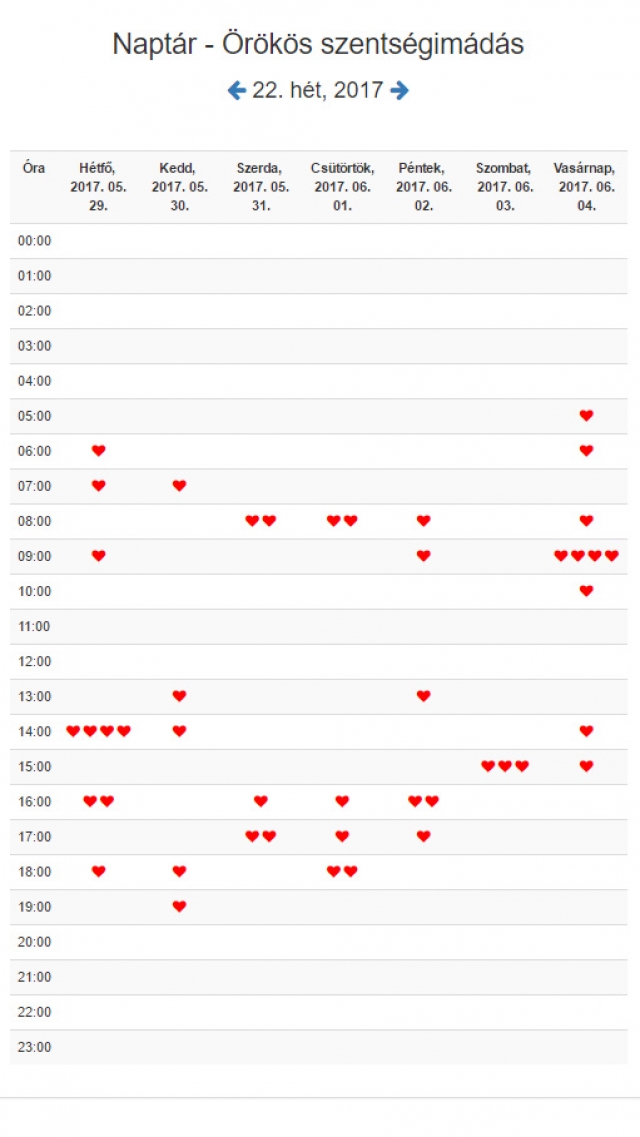 A Szent Ferenc Alapítvány honlapján, a www.magnificat.ro oldalon, középtájon megjelent egy iraki Káld keresztény templom oltárának a szentségfülkéje. A márvány tabernákulumon jól látszanak a golyó ütötte sebek, ha erre a képre rákattintasz, megjelenik egy ablak különféle időzónákkal, itt ki kellene választanod egy gombnyomással azt az országot, ahol végzed a szentségimádást. Ha döntöttél, akkor megjelenik az Örökös Szentségimádási naptár, és az ablak felső sarkában írja, hogy "jelentkezés". Amennyiben erre a szóra rákattintasz, megnyílik egy újabb ablak amit az adataiddal kérünk tölts ki, jelezzed, hogy melyik nap és hány órakor találkozol a szentségi Jézus Krisztussal. Majd a piros szívecskére kattintva, ellenőrizheted, hogy a gép elfogadta-e a jelentkezésedet, és természetesen megnézheted, hogy rajtad kívül még ki időzik az Eucharisztia előtt. Én azt szeretném, hogy a naptár minden rubrikája legyen tele piros szívecskékkel, hogy valóban Jézus Krisztusnak legyenek igaz imádói, a nap minden órájában.