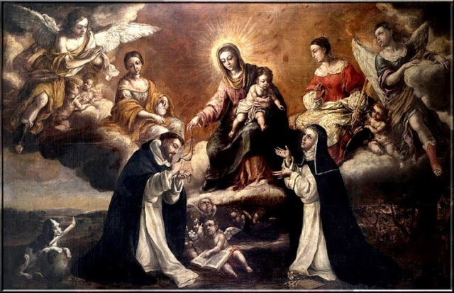 A hagyomány szerint a rózsafüzér neve onnan ered, hogy az első rózsafüzéreket Szent Domonkos összepréselt rózsaszirmokból készítette: „koszorút font” a Szűzanya számára.