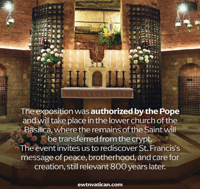 A kiállításra 2026. február 22. és március 22. között kerül sor, a szent halálának nyolcszázadik évfordulója alkalmából. A testet a kriptából áthelyezik, és a Bazilika alsó templomában található pápai oltár lábánál helyezik el.