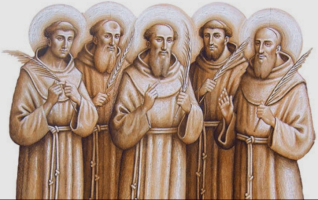 Szent Ferenc 1219-ben hat szentéletű társát a hitetlenek közé küldte, hogy hirdessék köztük Krisztus tanítását. Egyikük, Vitálisz testvér azonban Spanyolországban megbetegedett és nem tudta folytatni útját. Öten mentek tehát tovább: Berárd, Péter, Ottó, Akkurziusz és Adjutusz. Közülük az első három pap volt.