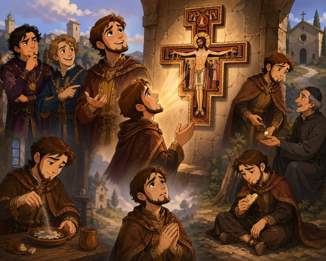 Napokkal később a Szent Damian kis templom közelében sétálva érezte a szívében, hogy be kell mennie . Ott, egy régi, kopott keresztre feszítés előtt maga Jézus szólt hozzá: