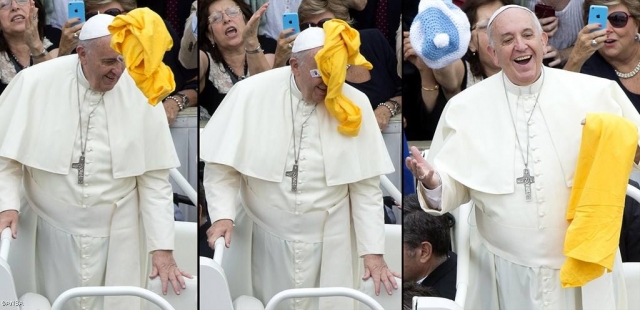 Röpködő sálak sapkák! Figyeljük meg Ferenc pápa reakcióját! Nem ijedezik, látszik, hogy nem fél, tiszta szívből nevet, szeméből, arcáról sugárzik az a tiszta öröm, amit az Istenhez közel álló emberekből árad! Milyen szép lenne, ha mi is jókedvvel kacagni tudnánk az élet ilyen- olyan váratlan dolgain fogadni!! Szeretettel, Csaba t. ![]()