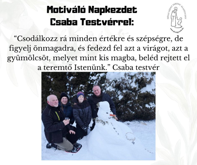 b_300_300_16777215_00_images_stories_Csaba_levelek_Resized_622295876_122230452686265175_4744044080020244320_n.jpgCsodálkozz rá minden értékre és szépségre, de figyelj önmagadra, és fedezd fel azt a virágot, azt a gyümölcsöt,melyet mint kis magban, beléd rejtett el a teremtő Istenünk.