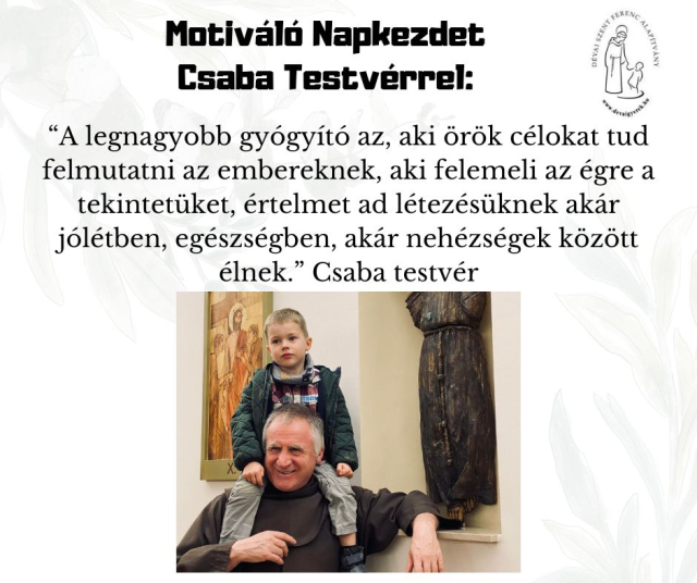 b_300_300_16777215_00_images_stories_Csaba_levelek_Resized_623932520_122230453124265175_4216981435181419196_n.jpgA legnagyobb gyógyító az, aki örök célokat tud felmutatni az embereknek, aki felemeli az égre a tekintetüket, értelmet ad létezésüknek akár jólétben, egészségben, akár nehézségek között élnek.
