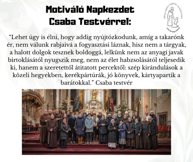 b_300_300_16777215_00_images_stories_Csaba_levelek_Resized_658355160_122240099816265175_794308795899115116_n.jpgLehet úgy is élni, hogy addig nyújtózkodunk, amíg a takarónk ér, nem válunk rabjaivá a fogyasztási láznak, hisz nem a tárgyak, a halott dolgok tesznek boldoggá, lelkünk nem az anyagi javak birtoklásától nyugszik meg, nem az élet habzsolásától teljesedik ki, hanem a szeretettől átitatoot percektől: szép kírándulások a közeeli hegyekben, kerékpártúrák, jó könyvek, kártyapartik a barátokkal.
